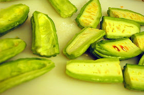 To this day I still can't stand the taste of bitter melon, but I can tolerate it if I hold my nose while eating it. Anyways, for those of you who like bitter melon (and I last night, I found out my two year old, J, likes it), or for those who haven't and would like to be adventurous, here's a simple and supposedly healthy recipe for you, courtesy of my mom. Variations of this dish is found in many cuisines, including Vietnamese, Filipino, Thai, and Japanese.