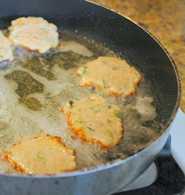 Once the oil is hot, drop in some of the patties, well-spaced, and fry for about 2 minutes per side. Once golden brown, remove the patties and let drain on paper towels.